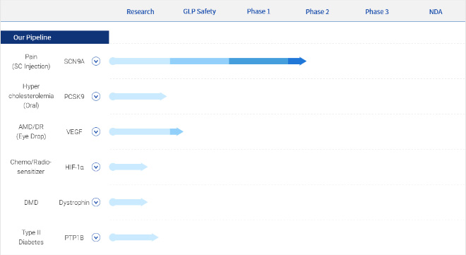 Since the establishment of the company, we have been conducting extensive research on various disease gene targets to identify the pharmacological properties of OliPass PNA. However as the mechanism of action of OliPass PNA has been elucidated as exon skipping, we plan to invest our R&D to build a portfolio of pipelines focusing on clinical development. In addition, we plan to actively collaborate with pharmaceutical companies and biotech companies to develop OliPass PNA Therapeutics from the early stage development and to introduce OliPass PNA into the market.