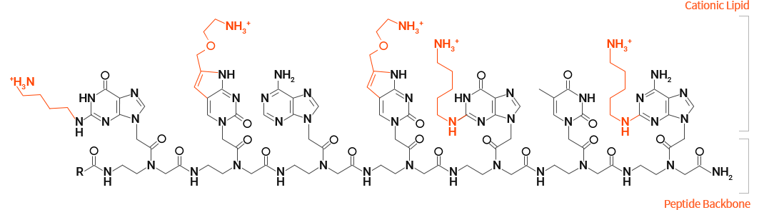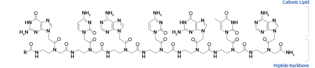 OliPass Peptide Nucleic Acid (OliPass PNA) was derived from PNA by rationally introducing cationic lipid moiety onto nucleobase. By covalently attaching such cationic lipid groups onto PNA, the cell permeability markedly improved. In addition, the affinity for RNA increased by at least a million times. Geared up with excellent membrane permeability and ultra-strong affinity for RNA, OliPass PNA is self-evolving as the most ideal platform for artificial nucleic acid therapeutics.