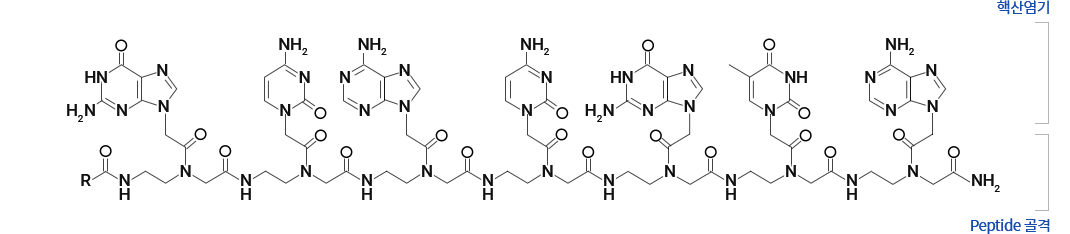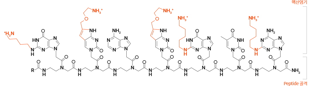 PNA는 DNA 혹은 RNA와 달리 Peptide 골격에 핵산 염기가 배열된 인공유전자로서, 약 30년 전에 덴마크의 Nielsen 박사 등이 발명한 매우 독특한 구조적 특성을 인공유전자입니다. 그러나 PNA 역시 세포투과성 부족으로 인공유전자 치료제 플랫폼으로 활용되는데 뚜렷한 한계를 보여주었습니다. 이제까지 PNA에 기반한 인공유전자 치료제가 개발된 바 없습니다.